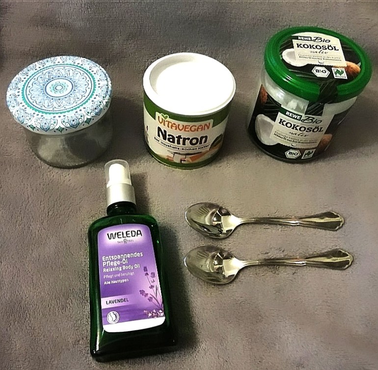 Ihr braucht Kokos-Öl, Natron und ein ätherisches Öl eurer Wahl. Ich habe mich bewusst für Lavendel-Öl entschieden, weil ich finde, dass es sehr angenehm riecht und eine antibakterielle Wirkung hat.